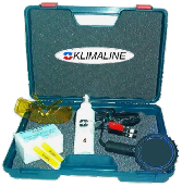 Набор из УФ лампы с очками и люминесцентной жидкостью предназначен для поиска утечек в системах кондиционирования автомобилей. Люминесцентная жидкость добавляется в контур системы охлаждения, перемешивается с хладагентом и в негерметичном месте выходит наружу вместе с хладагентом. Точное место утечки легко обнаруживается при визуальном осмотре с помощью ультрафиолетовой лампы (состав светится ярко-желтым цветом). В месте утечки остаются подтеки, таким образом можно обнаружить даже минимальные утечки. При значительных утечках в лучах ультрафиолетовой лампы можно наблюдать облако светящегося газа.