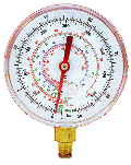 Фреоновые манометры предназначены для измерения избыточного и вакуумметрического давлений фреонов различных марок. Они устанавливаются в манометрические коллекторы и являются незаменимым инструментом при заправке и диагностировании холодильных установок и систем кондиционирования воздуха. Кроме основной шкалы давлений фреоновые манометры имеют дополнительные температурные шкалы для нескольких марок фреона. Эти температуры соответствуют давлению насыщения хладагента, которое указывается стрелкой на основной шкале.