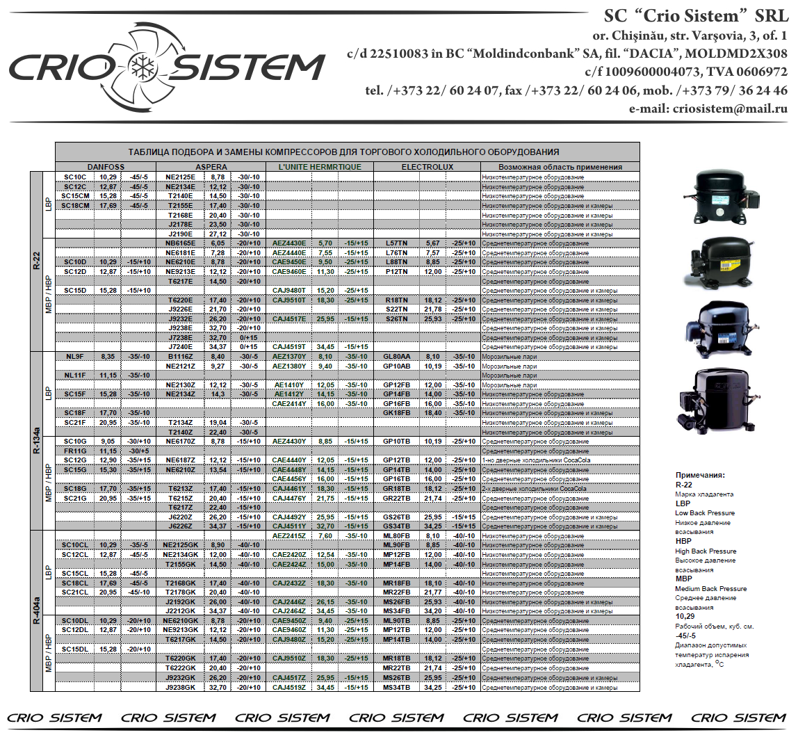Удобная таблица подбора аналогов коммерческих герметичных компрессоров